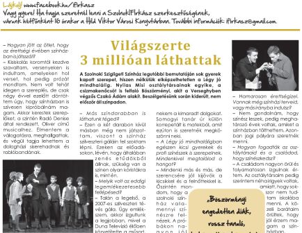 – Azt kell, mondjam, jól. Így, hogy kevesebb szabadidőm van a színház miatt, muszáj nagyon a tanulásra koncentrálnom, nem engedhetem meg, hogy más dolgok vonják el a figyelmemet. Persze nehéz volt bepótolni a próbák miatti lemaradásaimat, de szerencsére az osztálytársaim sokat segítettek, például a szünetekben igyekeztek elmagyarázni a nekem kimaradt dolgokat. Somogyi tanár úr külön korrepetált is matekból, amit ezúton is szeretnék megköszönni neki…
