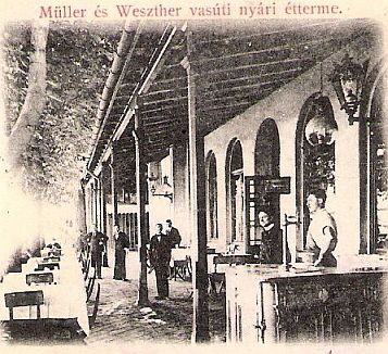 A bal oldali képen Müller és Weszther vasúti nyári étterme látható, pontosabban a vasútállomáson egykor található étterem terasza. Vendégek éppen nincsenek a képen, ám ettől függetlenül is érezhetünk valamit a korabeli hangulatból. A jobb oldalon, az ablakok előtt a söntés, a sörcsap, ami mögött ingujjra vetkőzve, mint egy harcba induló katona feszít a csapos. Mellette, az oszlopoknál és a távolban négy elegáns – talán szmokingot viselő, de mindenesetre zakót és nyakkendőt is hordó – pincér, akik szerintem fejből sorolták a napi választékot, ajánlottak és lebeszéltek, sőt sokakat ismerősként köszöntöttek. A csípőre tett kézzel álló úr pedig a főpincér lehetett, akinél a kedves vendégek fizethettek. A féltető alatt majolika kövezet, az asztalok fölött platánfa árnyéka.