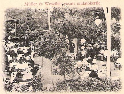 Nézzenek csak a másik – a képeslapon jobb oldali – képre! Ez ugyancsak Müller és Weszther urak vendéglátóipari-egységét ábrázolja, a csodálatos nevű vasúti mulatókertet. Nem lehetett véletlen a név, hiszen a kép bal felső sarkában cigánybandát vélek felfedezni. A kert pedig dugig tele. Egyetlen üres asztalt sem látunk. A hölgyek elegánsak – nézzék a kalapkölteményeiket -, az urak általában zakóban és kalapban. Mert akkoriban sem számíthatott mindennaposnak a vendéglőbe járás, még a vasúti mulató kert felkeresése sem, így megadták a módját. Igaz, bő száz esztendeje nem a tévé, a net, a mobil és a bevásárlóközpontok jelentették a hétvégi szórakozást, a találkozás és beszélgetés lehetőségét.
