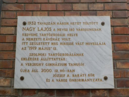 (Frissítés /2017. február 21./: Jakatics Árpád nyugalmazott tanár levelében arról tájékoztatott, hogy „Valkó Mihály, mint magyar szakos tanár és osztályfőnök saját osztályának tanulóival – bizonyos kutatómunka és szervezkedés nyomán – elérte, hogy Nagy Lajosnak emléktáblája lett Szolnokon”. Ezt a táblát azonban ismeretlen barbárok megsemmisítették, így a ma látható emléktábla annak egy újravésett és kiegészített változata.)