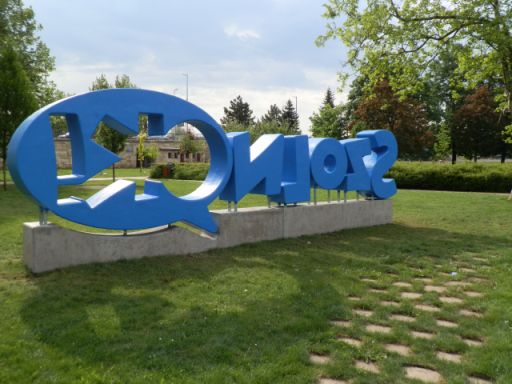 Szerintem nem. Mert akkor azon is elgondolkodott volna, hogy érdemes lenne a felirat elé valami kövezett utat, járdát, terecskét csinálni. Mondjuk legalább olyat, amilyen jelenleg a felirat mögött fut. Tudom, most még szépen mutat a kék betűk előtt a zöld fű, de a kitaposás és a kopás nyomai már néhány nap után láthatóak. Mi lesz itt a nyár végére? Arról nem is beszélve, hogy a reggeli harmat vagy egy kiadós eső után sem lesz túl praktikus a betűk megközelítése.