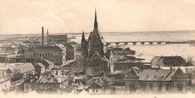 Néhány évvel későbbi árvíz a másik irányból megörökítve. Ezt a képet 1905 körül készítette valaki a Belvárosi Nagytemplom tornyából, és ebben az esetben sem zárható ki, hogy kifejezetten a nagyvíz miatt. A református templom mögött nemcsak a fahíd látható, hanem az is, hogy a mai sétány, a Tisza park és a játszótér területére is betört a víz. Ami nem meglepő, ha tudjuk, hogy a várost védő töltést majd csak az 1930-as árvíz után építették meg, és így a sétány kiépítésére is csak akkor kerülhetett sor. Azért érdemes a hídon túlra, a mai mentetlen, Alcsi és Szajol irányába is elnézni: tényleg a víz volt az úr.