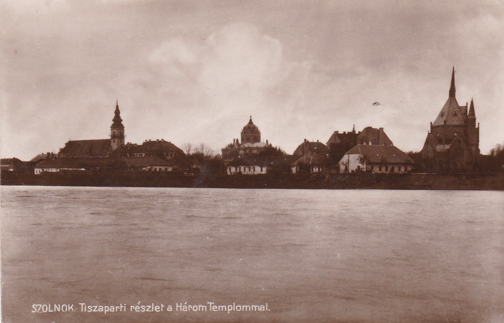 Valamikor a harmincas évek elején készülhetett ez a kép a Tisza bal partjáról, és a fotós célja a szolnoki toleranciát, el- és befogadást hirdető három templom megörökítése volt. Közben azonban ránk hagyta a két világháború közötti időszak egyik árvizének képi emlékét is, amikor már bőven a várost védő töltésnél járt a Tisza. Milyen érdekes, hogy ott, ahol ma hatalmas fák takarják ki a városképet, kilencven évvel ezelőtt egyetlen fa sem volt. Mondanám, hogy az új töltés építésének estek áldozatul, de ezt a címlapképnek használt, első világháború előtti (szerintem 1912-es fotóból színezett) képeslap cáfolná. Ugyanis azon sincsenek fák a Tisza-parton.
