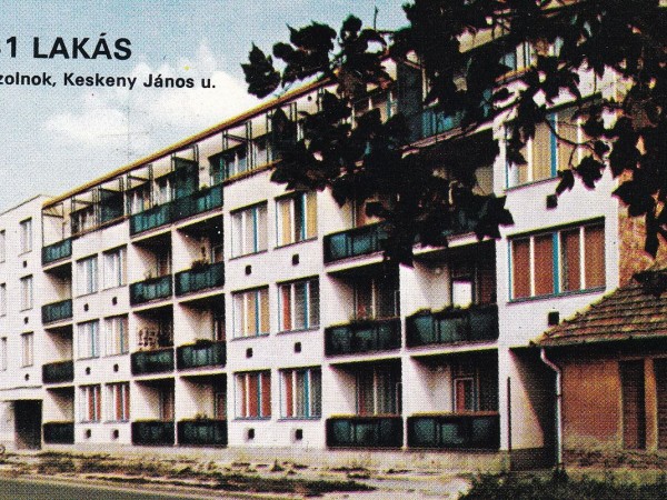 Így kerülhetett erre az 1979-es naptárra a szolnoki ÉPSZER Vállalat által 1978-ban kivitelezett Keskeny János utcai, 31 lakásos társasház, ami a maga nemében az egyik első volt azon a környéken. A ház természetesen ma is áll, igaz már a Pozsonyi út 25-29. szám alatt, hiszen időközben volt egy rendszerváltás, ami elsodorta az egykori helyi kommunista aktivista nevét, holott Keskeny Jánost (1909-1945) egy szovjet katonai teherautó gázolta halálra. Jelenleg az épület külső homlokzata sem fehér, hanem rózsaszínű, miként az erkélyek kékes üvegét is – egy kivétellel – kicserélték az elmúlt négy és fél évtizedben. És természetesen 45 év elteltével már a házat sem lehet a korábbi módon megörökíteni, hiszen a Pozsonyi úti platánok eltakarják.