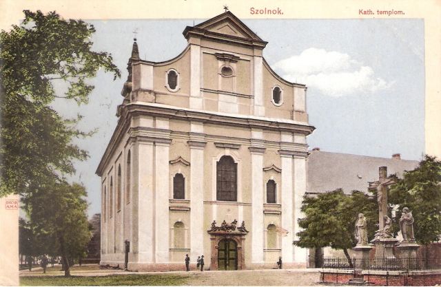 Ebből gondolom, hogy a 104 évvel ezelőtt Szolnokon járó Béla nem véletlenül választotta ezt a képeslapot az üzenet elküldésére. A valószínűleg színezett anziksz ugyanis Szolnok legnagyobb, akkor ugye már bő másfél évszázada álló katolikus templomát, az előtte levő teret és a Kálváriát mutatja. Amit tulajdonképpen ma is pontosan ugyanilyennek láthatunk azzal az eltéréssel, hogy a Kálváriát a tér közepéről a rendház kerítéséhez telepítették valamikor. Esküszöm, a fák is mai méretűek. Egyetlen dolog hiányzik erről az 1910 körül készült felvételről, a nagytemplom oldalából a Szentháromság szobor torzója, ami ugye ekkor még a Kossuth tér dísze volt – persze nem romokban.
