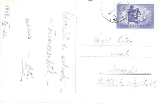Abban azonban itt is biztos vagyok, hogy a feladók nem véletlenül választották éppen ezt a képeslapot a szolnoki kínálatból. Sőt, ha esetleg volt is más lap a Belvárosi Nagytemplomról, talán akkor is ezt küldik el a „Ferencrendiek temploma” felirat miatt. A címzésből sajnos nem derül ki, hogy Weyer Péter úr mivel foglalkozhatott Szegeden, mindenesetre a két – sajnos kisilabizálhatatlan aláírású – feladó azt tartotta a legfontosabbnak, hogy a szolnoki ferencesektől küldik az üdvözletüket. Mindezt 1949. augusztus 23-án! Ami azért némi bátorságra, civil kurázsira vagy tudatlanságra utal. Mert 1949 nyarán ugyan még jó egy év volt hátra a magyarországi szerzetesrendek feloszlatásáig, ugyanakkor az egyházi birtokokat már négy éve szétosztották, az egyházi társadalmi szervezeteket három éve feloszlatták, egy éve pedig már az egyházi iskolák is állami kezelésben voltak, sőt Mindszenty bíboros már bő fél éve „élvezhette” az ÁVH vendégszeretetét.