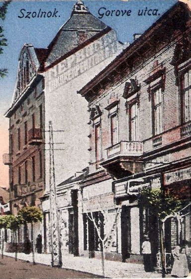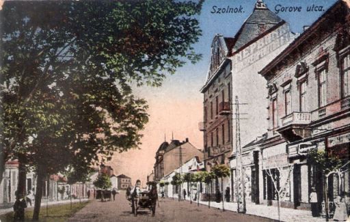 Ez a soha postára nem adott képeslap a hátoldala, illetve a Gorove utca – cz nélkül – felirata alapján szerintem nagyjából száz éve, valamikor az első világháború előtt vagy első éveiben készült. Klasszikus festett képeslapról van szó, aminek a készítésekor azonban a festő kicsit túlgondolta Szolnok akkori főterét.