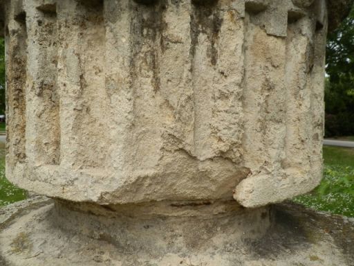 Ahogy a Vártemplom mögötti parkban szerényen megbújó szobrot és talapzatát elnézem, még néhány év és nemcsak a mellékalakok eltűnése miatt fogunk keseregni. Maga a főalak még viszonylag ép, maximum kissé elszíneződött és megkopott. A talapzattal összekötő csonka oszlopból viszont már komoly darabok hiányoznak, itt-ott pedig a vasszerkezet is kikandikál. A legrosszabbul azonban a talapzat néz ki, amire pedig Szent Flórián alakját vésték, minden bizonnyal a Szolnokot is rendszeresen érintő tűzvészek miatt.