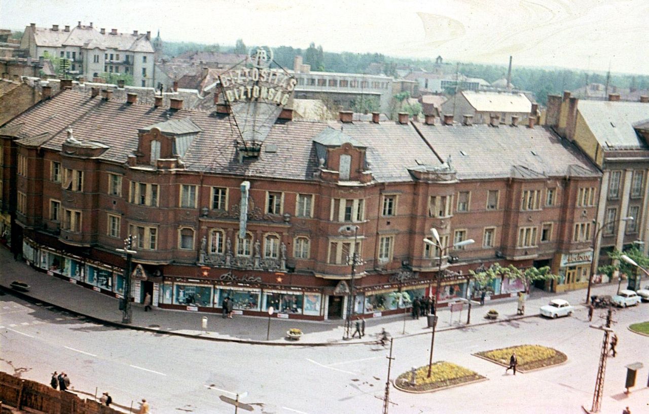 Nem hinném, hogy a fotó készítője a megyei, a járási vagy a városi pártbizottság, esetleg az akkori állampárt (MSZMP) csatolt részeinek dolgozója lett volna, inkább a kivitelezők vagy azok élelmes ismerősei között keresném az „elkövetőt”, akinek 1965. április 4-e, az átadás előtt sikerült bejutnia az épületbe. Ha jól tippelem, akkor a kereszteződésre néző oldal legfelső emeletéről lőtte ezt a két képet, aminek köszönhetően a Nerfeld-palota fölött is elnézhetünk. Bal oldalon az a gangos épület a városháza melletti városi bérház a Táncsics utcában, amit nem sokkal a Nerfeld-palota előtt építettek a Speyer-kölcsönből. Középen a hosszú, lapos tetős ház a hadkiegészítési parancsokság tömbje, ami elé alig egy évtized múlva húzzák majd fel a Helyőrségi Művelődési Otthont, azaz a HEMO-t. Tőle jobbra a Tisza-szálló tornya és a mainál jóval magasabb kéménye tűnhet fel, előtte a színház 1964-ben elkészült bejárati tömbjével. És helytörténetileg legalább ennyire fontos a Nerfeld-palota és a nagy OTP épülete mögött látható nyeregtetős épület, a Magyar utca első társasháza is, ami a Szolnok belvárosában megjelenő új beépítési forma nyitányaként is értelmezhető.
