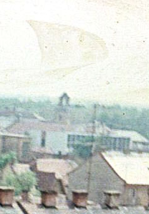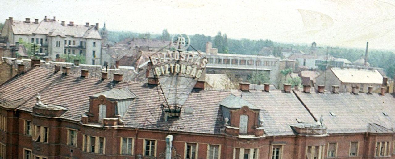 Nem hinném, hogy a fotó készítője a megyei, a járási vagy a városi pártbizottság, esetleg az akkori állampárt (MSZMP) csatolt részeinek dolgozója lett volna, inkább a kivitelezők vagy azok élelmes ismerősei között keresném az „elkövetőt”, akinek 1965. április 4-e, az átadás előtt sikerült bejutnia az épületbe. Ha jól tippelem, akkor a kereszteződésre néző oldal legfelső emeletéről lőtte ezt a két képet, aminek köszönhetően a Nerfeld-palota fölött is elnézhetünk. Bal oldalon az a gangos épület a városháza melletti városi bérház a Táncsics utcában, amit nem sokkal a Nerfeld-palota előtt építettek a Speyer-kölcsönből. Középen a hosszú, lapos tetős ház a hadkiegészítési parancsokság tömbje, ami elé alig egy évtized múlva húzzák majd fel a Helyőrségi Művelődési Otthont, azaz a HEMO-t. Tőle jobbra a Tisza-szálló tornya és a mainál jóval magasabb kéménye tűnhet fel, előtte a színház 1964-ben elkészült bejárati tömbjével. És helytörténetileg legalább ennyire fontos a Nerfeld-palota és a nagy OTP épülete mögött látható nyeregtetős épület, a Magyar utca első társasháza is, ami a Szolnok belvárosában megjelenő új beépítési forma nyitányaként is értelmezhető.