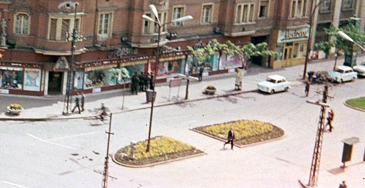 Persze az utcaszint sem kevésbé érdekes. A legfontosabb, hogy ekkor még nem szerelték fel Szolnok első közlekedési jelzőlámpáit ide, és a zebráknak is csak a szélét jelölték. A mai Szapáry, akkori Ságvári út közepén viszont járdasziget húzódott, amiket majd csak egy évtizeddel később, a 4-es főút átkelési szakaszának rekonstrukciója után számoltak fel. A képen két, ugyanolyan 500-as, kék-fehér fényezésű Trabant látható, amelyek közül az első előtt, a járda szélén álló fa körül jellegzetes hirdetőoszlop szolgálta a tájékozódást. És mint látható, a mai napig kiirthatatlan kerek kő virágtartókból már ekkor is volt Szolnokon, miként a meghatározhatatlan alakú villanyközmű-szekrényből is. De hát nincs ebben semmi meglepő. Csak hatvanéves ez a kép. Igaz, azóta nemcsak a Tiszán folyt le sok víz, de a néhai Ságvári és Beloiannisz utca kereszteződésében is nagyon sok minden változott.