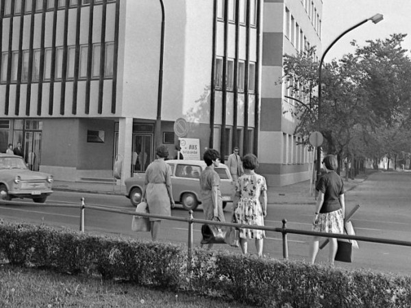 Miből gondolom, hogy kora délután készült a kép? Vessenek egy pillantást a kép közepén, az épület sarki frontjára. Egy fa árnyéka látszik, ami csak délután fordulhat elő. A fák lomkoronájából és a hölgyek nyárias öltözetéből pedig arra következtethetünk, hogy egy szép késő nyári, kora őszi napon készült a felvétel, 1964 után. Miért? Mert a képbe balról érkező Trabant 601-eseket 1964-től árusították Magyarországon.