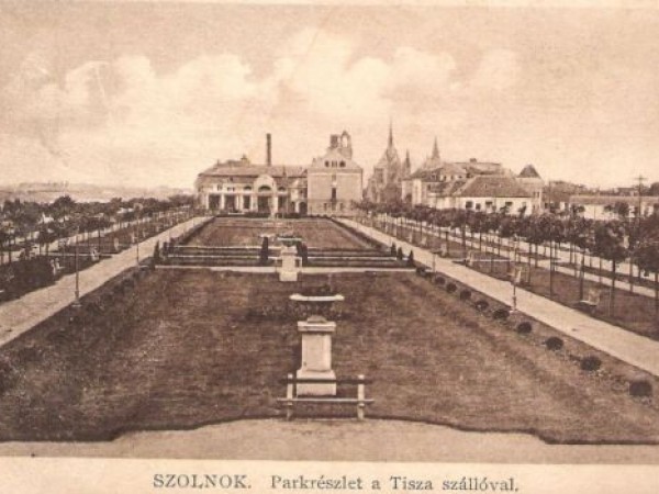 Ezt a lapot egyébként a szolnoki Gerő Ignácz adta ki, és ha jó a szemem, azt is meg merem kockáztatni, hogy a felhasznált fotónak 1934 előtt kellett készülnie. Nekem ugyanis úgy tűnik, hogy a kép előterében és a mögötte lévő kővirágtartók, valamint a békás szökőkút után, már majdnem a Tisza szálló kerítésénél egy harmadik kőtál is áll egy oszlopon. Márpedig ha ezt jól látom, akkor a fotónak azért kellett 1934 előtt készülnie, mert abban az évben került a mai helyére Borbereki Kovács Zoltán Verseghy Ferencet ábrázoló mellszobra.