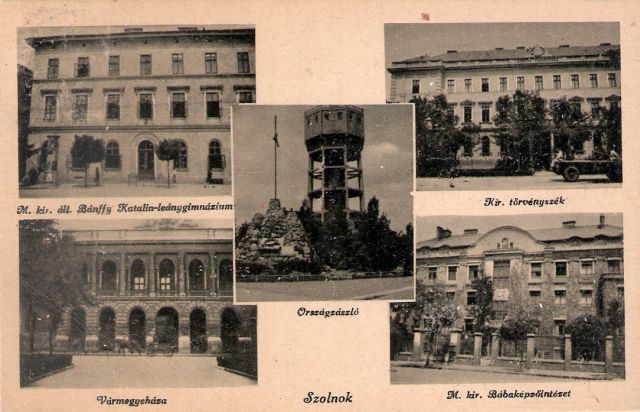 A jobb alsó sarokban a mai Közgé és a megyei rendőrkapitányság között található Árpád-ház nevű lakóházat látjuk még első funkciója idején. Lépcsőházi homlokzatán mintha az eredeti koronás címert látnám, ami ugye a második világháború után tűnt el. A vadszőlő viszont már alaposan befutotta, így biztosak lehetünk abban, hogy sok évvel az épület átadása előtt lett megörökítve a Trianon után Szolnokra telepített intézmény. A középső kép pedig a megcsonkított országra is emlékeztető Országzászlót mutatja, ami az Eötvös téren, az akkor még működő víztorony előtt, szerintem a ma ott álló 68-as obelszik helyén lehetett.