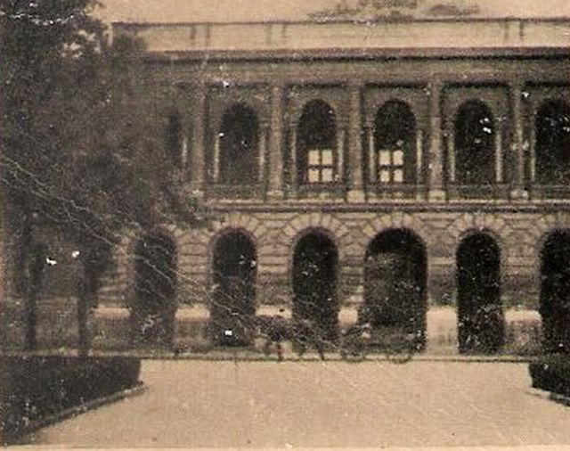 A jobb felső sarok a Királyi törvényszék, azaz a mai bíróság épülete, aminek fotózásához alig pár métert kellett Oláh Miklósnak megtennie előző pozíciójához képest. Szerintem a Lengyel légió utca torkolatában állva dolgozott. És amint látszik, a bíróság előtt már akkor is méretes fák álltak, viszont parkolóra a gyér járműforgalom miatt még nem volt szükség. Nem is igazán tudom eldönteni, hogy a képből kifelé haladó, gumikerekes jármű micsoda: valami lovas kocsi, harci szekér, netán egy különleges teherautó.