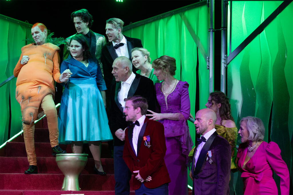 Szóval itt inkább egy prózai drámáról van szó, ami a címe ellenére messze nem gyerekdarab, vagy mesejáték, legfeljebb felnőtteknek szóló mese. Mert persze elsőre kicsit infantilis, hogy egy képzeletbeli ország semmire kellő trónörökösét úgy buktatja meg a helyi elit, hogy a helyére a hatalmas répát ültetnek, aminek (akinek?) aztán mindenki behódol. Csakhogy itt egészen egyértelműek az utalások, az áthallások, amelyek messze nem a 19. századi Franciaországra, hanem a 2025-ös Magyarországra vonatkoznak. Ha van kortárs dráma, ami napjainkról szól, akkor a budaörsiek Répakirálya egyértelműen az, hiszen a hatalom visszaszerzéséért harcba induló trónörökös körül nagyon sok olyan dolog történik, ami a színház falain kívülről ismerős lehet. Kis túlzással azt is mondhatjuk, hogy a Latinovits a Katona, az Örkény és a Radnóti nyomdokain haladva nem szórakoztatva elmismásolni akarja a jelent, hanem képletesen megütni, rádöbbenteni és gondolkodtatni. És ennek láthatóan meg is van a maga közönsége. A harmadik előadásuk kis túlzással olyan volt, mintha Budapest belvárosa kiköltözött volna Budaörsre.