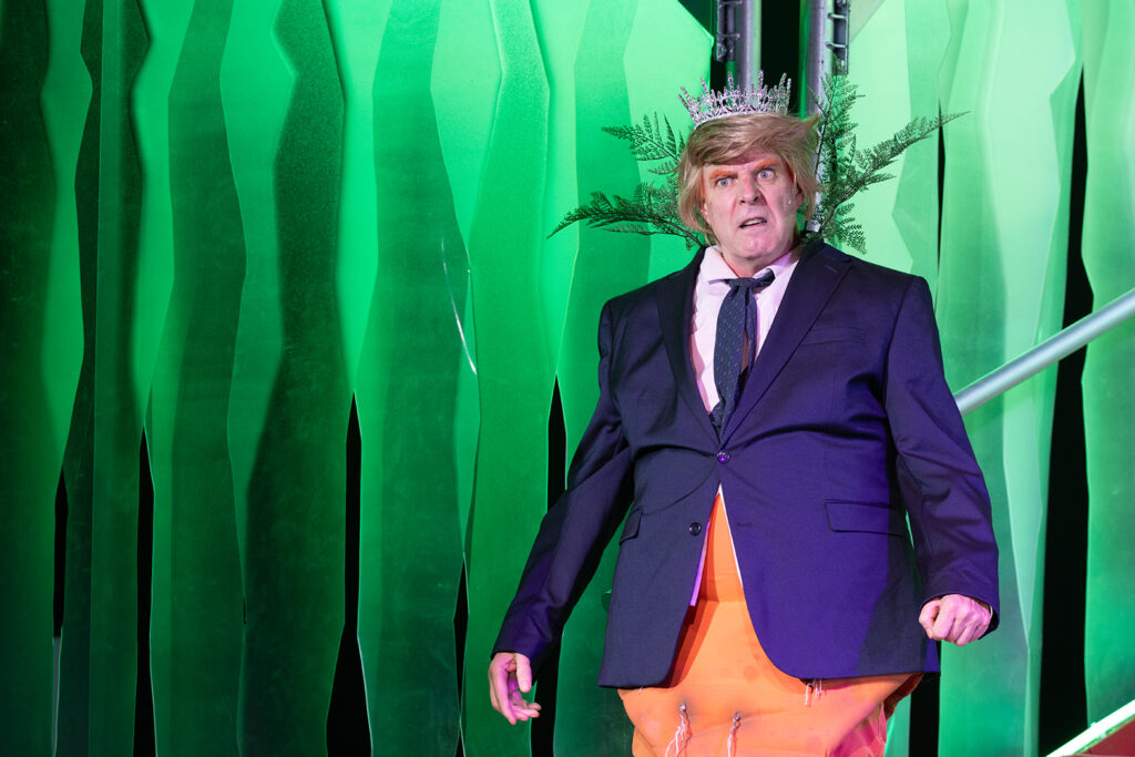 Szóval itt inkább egy prózai drámáról van szó, ami a címe ellenére messze nem gyerekdarab, vagy mesejáték, legfeljebb felnőtteknek szóló mese. Mert persze elsőre kicsit infantilis, hogy egy képzeletbeli ország semmire kellő trónörökösét úgy buktatja meg a helyi elit, hogy a helyére a hatalmas répát ültetnek, aminek (akinek?) aztán mindenki behódol. Csakhogy itt egészen egyértelműek az utalások, az áthallások, amelyek messze nem a 19. századi Franciaországra, hanem a 2025-ös Magyarországra vonatkoznak. Ha van kortárs dráma, ami napjainkról szól, akkor a budaörsiek Répakirálya egyértelműen az, hiszen a hatalom visszaszerzéséért harcba induló trónörökös körül nagyon sok olyan dolog történik, ami a színház falain kívülről ismerős lehet. Kis túlzással azt is mondhatjuk, hogy a Latinovits a Katona, az Örkény és a Radnóti nyomdokain haladva nem szórakoztatva elmismásolni akarja a jelent, hanem képletesen megütni, rádöbbenteni és gondolkodtatni. És ennek láthatóan meg is van a maga közönsége. A harmadik előadásuk kis túlzással olyan volt, mintha Budapest belvárosa kiköltözött volna Budaörsre.