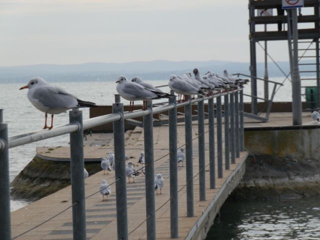 Máshogy telik az idő a közlekedésben is. Csak éppen tudni kell eltölteni az időt, ha éppen negyven percet kell várni Szántódnál a kompra. De így legalább jut idő körbejárni a Dianóczky János tervei alapján 1962-63-ban épített kikötői várótermet, ami bár vasbeton, mégis akár sirálynak vagy egy vitorlás hajónak is nézhetem, és részemről befér a szocialista építészet gyöngyszemei közé. A tetejére csak azért jutott volna eszembe felmászni – végül nem tettem meg -, mert minden pillérénél tábla figyelmeztet, hogy ez tilos. Így nem maradt más, mint az őszi móló, ahol különösebb beavatkozás nélkül le lehetne forgatni valami északi krimit: magány, csapkodnak a hullámok, susog a nádas, jönnek a madarak. Szórakoztatóbb így, mint nyáron.