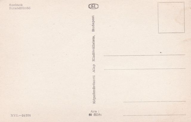 Az 1949 tavaszán átadott Damjanich uszodáról viszonylag kevés képeslap készült, és azok is inkább 1967 utániak, amikor már a lelátóval fedett sportmedence is állt. Damjanich 1849-es szolnoki csatájának 100 éves évfordulóján megnyitott, és ezért a tábornok nevét kapó létesítmény belsejéről persze több fotót ismerünk már az ötvenes-hatvanas évekből is, de talán csak kettő van, amelyekből a Képzőművészeti Alap Kiadóvállalata képeslapot csinált. Az egyik ez a 60 filléres, felirata szerint „Szolnok Strandfürdő”-t ábrázoló nyomtatvány, amelyen nem látszódik a fedett medence, így a képes oldalán lévő fotó 1949 és 1967 között szinte bármikor készülhetett.