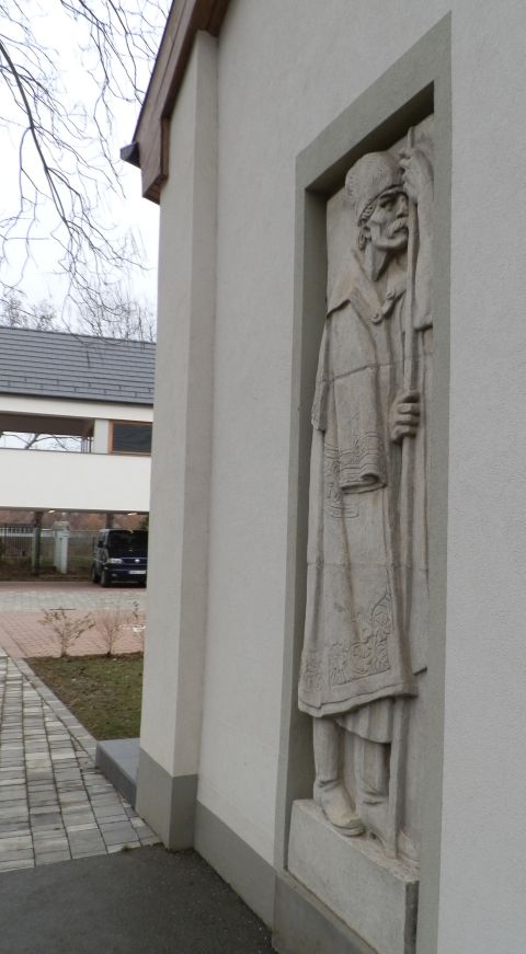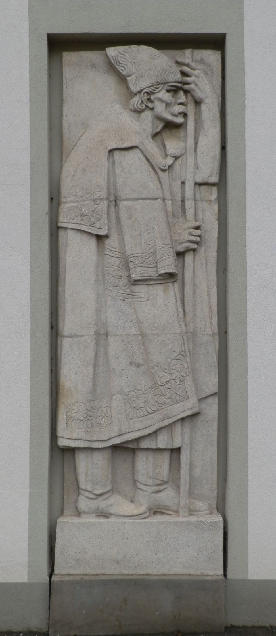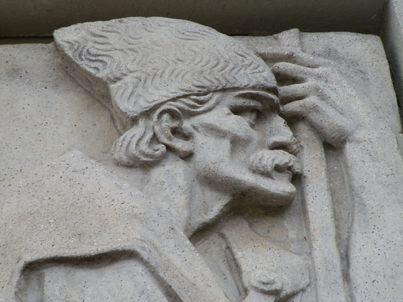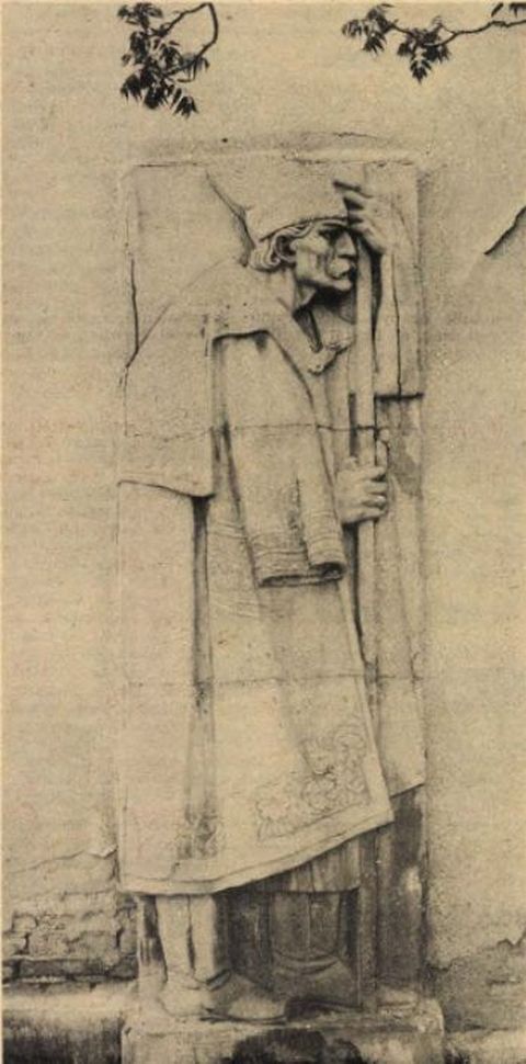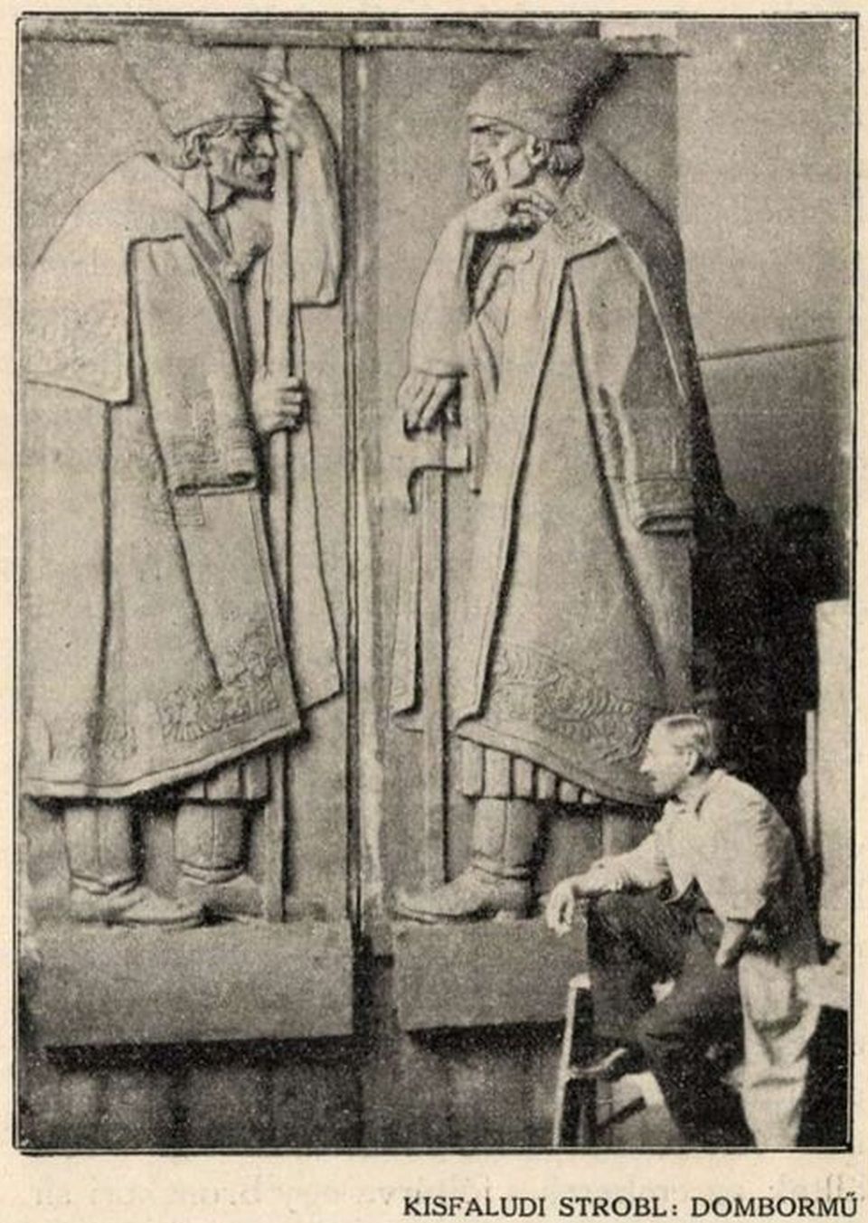 A Szolnoki Művésztelep II-es épületének – amiben nem a galéria van, hanem csak művészlakások – Zagyva felőli végén egy legalább három méter magas, kőből faragott, láthatóan több részből összeillesztett dombormű található. A Vártemplom irányába néző, kucsmás, beesett arcú figura (öregember) egy hosszú botot fog mindkét kezével – avagy arra támaszkodik, az akár juhászbot is lehet -, csizmát illetve szélein aprólékosan kidolgozott cifraszűrt visel. A faragványon sajnos sehol sem látható szignó, ám egy 1913. január 5-én, az Élet című irodalmi folyóiratban novella illusztrációként megjelent fotó alapján egyértelműen kijelenthetjük, hogy Kisfaludi Strobl Zsigmond, legkésőbb 1912-ben elkészült alkotásáról van szó.