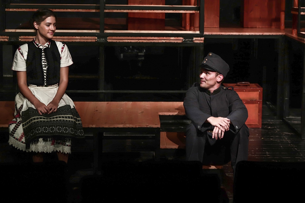És ez igaz Valcz Péter első szolnoki rendezése is. Mintha nem is Szolnokon lennénk. Vagy, mintha egy sötét, nehéz levegőjű szoba összes ablakát kitárták volna, és azt átjárná a fény meg a friss levegő. A Bakaruhában Kinczel József és Mérei Gabriella révén már a nézőtér előtt elkezdődik. És nem akarom lelőni a poént, de már akkor is megy, amikor még csak elfoglaljuk a helyünket. Ez nem is nyílt színi díszletezés, nem is a színpad széli takarások kiiktatása, hanem a játéktér elképesztő kitágítása és a nézők beszippantása. Kitartóan, végig az egész előadás alatt. Ám miközben kicsit belelátunk az előadás születésébe, és talán ott motoszkálhatna bennünk, hogy ez csak színház, a játék olyan sodró erővel visz a történetben, hogy azt érzem, ez nemhogy szükséges, de csak így lehet.