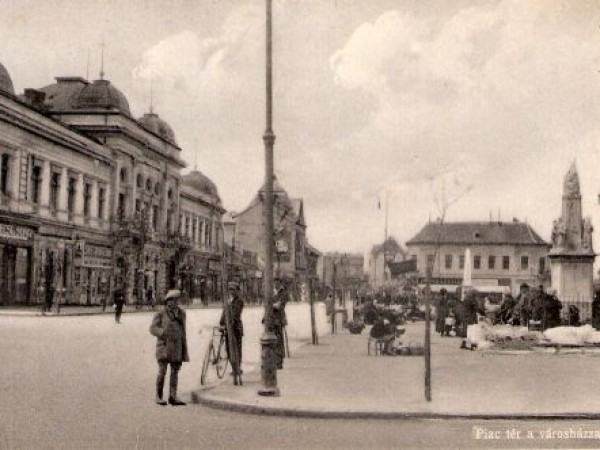 A kép bal oldalán a városháza látható. Akkoriban még nem ügyfélszolgálat, házasságkötő terem és irodák foglalták el a földszintet, hanem a térre nyíló portálok mögött működő üzletek. Talán mert a még harmad ekkora lakosú várost kevesebb hivatalnok is el tudta irányítani. Érdemes egy pillantást az épület tetejére is vetni, és felidézni a mai tetőszerkezetet. Az ezen a képeslapon még látható, egykori sarki és főhomlokzati kupolák már nincsenek a helyükön, gondolom, vagy a második világháborúban, vagy a későbbi tér ?rehabilitáció? során pusztultak el.