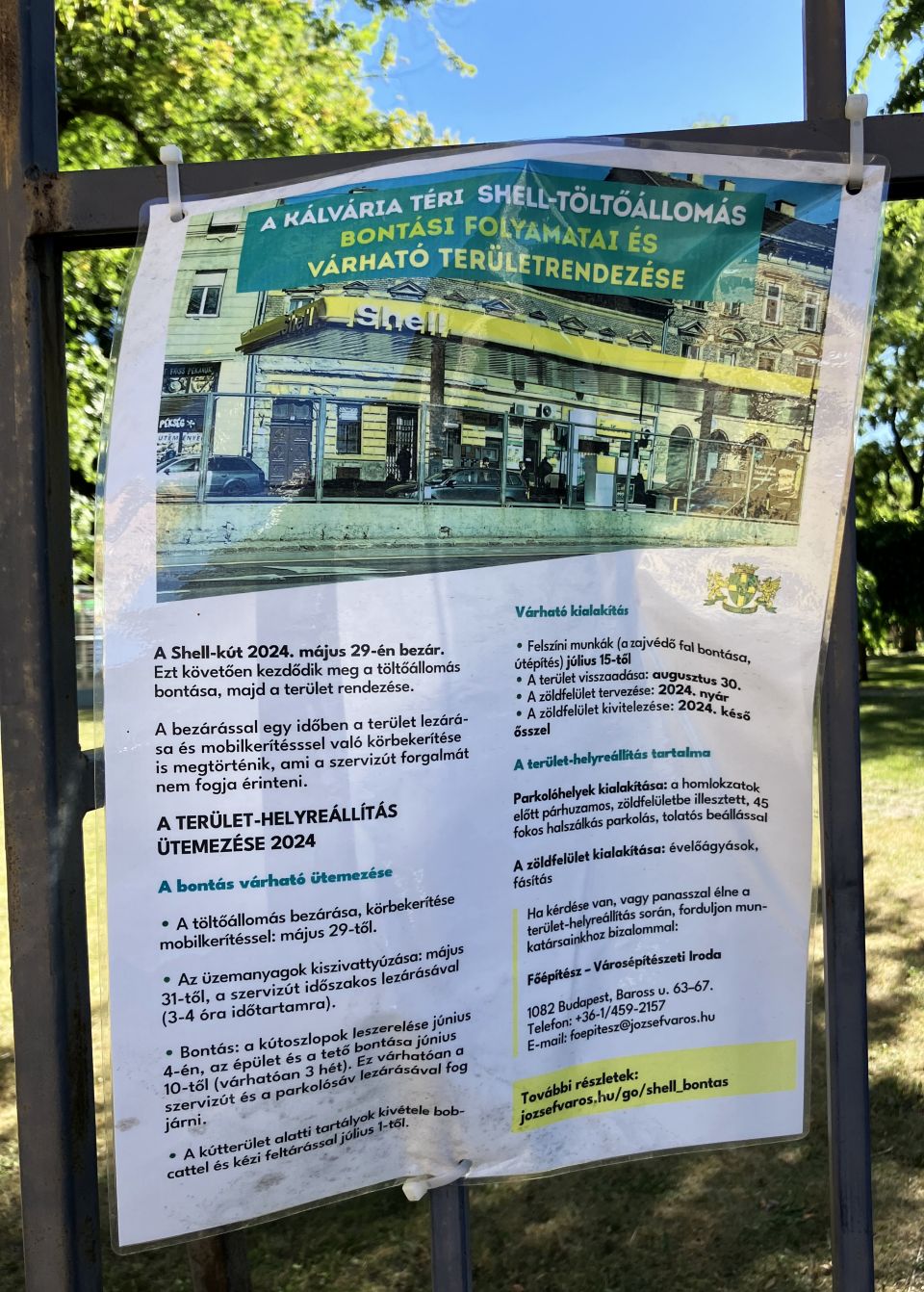 Budapest VIII. kerületében, azaz a tévesen még mindig nem túl jó hírű Józsefvárosban, a Baross utca és a Kálvária tér találkozásánál idén májusig működött egy benzinkút. Az üzemanyagtöltő május 29-én azonban bezárt, mobilkerítéssel körbekerítették, a maradék üzemanyagot május 31-én kiszivattyúzták, a kútoszlopok és a tető három hetesre tervezett bontását pedig június 10-én megkezdték. Ezt követően történt meg a földben lévő tartályok kiemelése, majd július 15-től elindulhattak a felszíni munkák, hogy a területre ezen a nyáron megtervezett zöldfelület és parkolók ősszel elkészülhessenek.