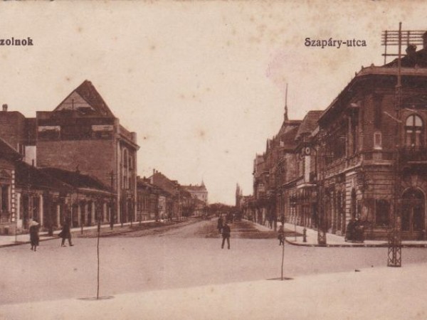 Kevés újdonságot tudok ezzel a képeslappal kapcsolatban mondani, hiszen éppen három és fél évvel ezelőtt már írtam ugyanennek a felvételnek a színes változatáról, amit anzikszként legkésőbb 1922-ben küldhetett egy bizonyos Margit Szolnokról a fővárosba. A képet nagyjából a mai Szapáry és Baross utcák kereszteződésének közepéről készítették, és a város akkori korzóját, a szépen fejlődő, néhai Molnár utcát örökítette meg. A fotózás helyéből kiindulva, ma már azt mondanám, hogy a képet akár Szigeti Henrik is készíthette, akinek az egykori fotós háta mögött álló 1907 és 1964 között álló Kereskedelmi Bank épületének második emeletén volt híres műterme.