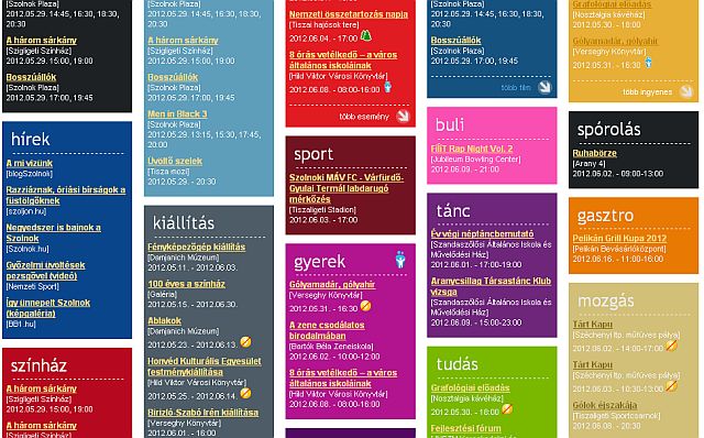 Az oldalt egyébként igyekeztük áttekinthetővé tenni, ezért harminc különböző kategóriát találtunk ki, amibe a programok elhelyezhetők. Természetesen lehetnek olyan programok, amelyek több, úgynevezett dobozba is beférnek, mert például szabadtériek, ingyenesek és a gyerekeknek szólnak. Egy-egy programhoz minden esetben tartozik egy részletesebb leírás, amiből előbb-utóbb minden hasznos információnak – mint például a várható időtartam, a belépők ára – ki kellene derülnie. Elsősorban azért, hogy az oldal olvasói el tudják dönteni, érdekli őket az esemény vagy sem. Az „1 órán belül” és a „mai” dobozokba időrend szerint, automatikusan kerülnek be a programok, hátha valakinek az utolsó pillanatban jut eszébe, hogy nem tudja, mit is csináljon.