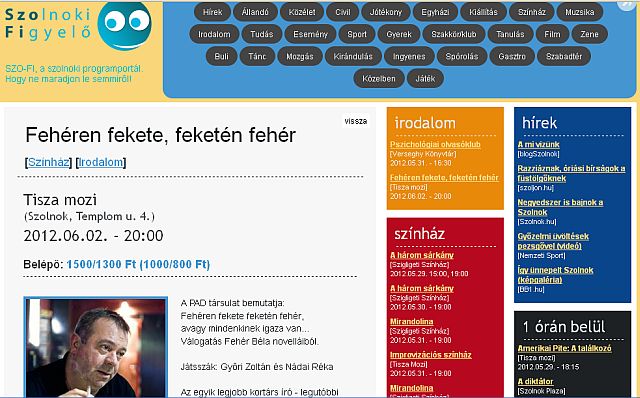 Egy ideig bizakodtam, hogy az internet korában a net segítségével megtalálom a szolnoki programokat. Főleg, hogy sok programszervező állítja, a kiváló rendezvényei ott vannak a saját honlapján vagy a közösségi felületeken, csak el kellene olvasni, mit kínálnak. Igen ám, de ha a közösségi felületeken nem vagyunk ismerősök, akkor lemaradok az adott hely üzeneteiről. Plusz előbb listát kellene csinálnom minden olyan programot kínáló helyről, aminek a weblapját időnként fel kellene keresnem. És még így sem érném el a célomat, hiszen a legtöbb intézmény és szórakozóhely oldalán eldugva, hiányosan vagy egyáltalán nem jelennek meg az aktuális programok. Arról nem is beszélve, hogy nincs időm naponta órákig böngészni a netet, hátha rábukkanok valami érdekes programra.