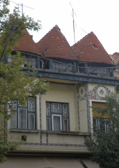 Megengedve a tévedés lehetőségét, két további épületet vennék fel a pusztuló szolnoki szecesszió listájára, ráadásul mindkettő a város főutcáján, a Baross úton található. Az egyik a főposta Bauhaus stílusú épülete és a Madách utca sarkán álló, a maga nemében az egyik legszebb hatvanas évekbeli lakóház közé beszorítva áll (5. kép). Miután több helyen is hullik róla a rózsaszín vakolat, itt-ott előbukkan a korábbi díszítés. Amiket az erkély vasrácsa és a kiugró tornyocska mellé téve, talán megengedhető késői szecessziós háznak tippelni.