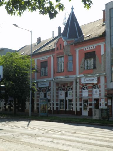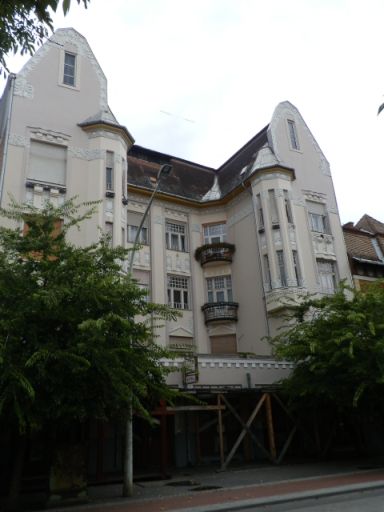 Úgy gondolom azonban, hogy a szolnoki szecesszió ennél jóval gazdagabb. Mert szerintem ilyen stílusban épülhetett az Arany János utca 1. szám alatti egyemeletes ház (3. kép), pontosan a Mezőgazdasági Takarékpénztár mögött. Homlokzata kritikán aluli állapotban van, ám a tetőzet alatti és az ablakok körüli maradványok a szecesszió hatására utalnak. Ugyancsak ilyennek érzem az emeleti erkély gyönyörű vasrácsának formavilágát, illetve az ide nyíló ablakokat. Bizonyos, hogy a szomszédjához képest kevésbé volt díszes, de kiemelkedően szép homlokzatú ház lehetett egykor.