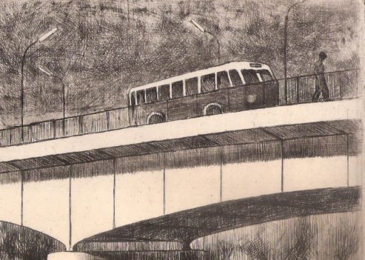 Valószínű, hogy Zsoldos Nagy Illés 1967-ben készült grafikája valamilyen közintézmény falát díszíthette a rendszerváltásig, majd a hozzá hasonló realista alkotásokkal együtt kiselejtezték. Rengeteg hasonló kép született a Kádár-korban – Szolnokról is -, és valószínű, többségük azóta meg is semmisült. Ezért vettem meg a Tisza-hídon átrobogó autóbusz rajzát.
