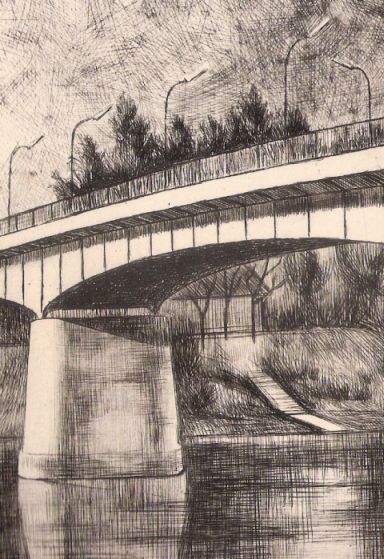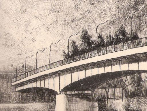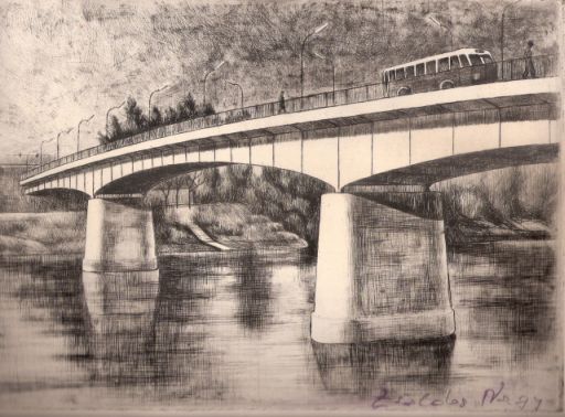 Zsoldos Nagy Illés Tisza-híd című grafikája egyébként egész jó, de valószínű, hogy csak nekünk, szolnokiaknak egyértelmű, mit is ábrázol. Miként az is csak nekünk fontos, hogy a rajz éppen öt évvel az új, állandó Tisza-híd átadását követően készült. Igen akkor, amikor még ilyen nagyfejű, negyvenöt fokban behajló lámpák biztosították a közutak megvilágítását. Amelyek akkoriban még nem voltak túl forgalmasak, talán ezért is látni csak egyetlen buszt a hídon. Aminek a márkáját csak azért tudjuk egyértelműen megmondani, mert akkoriban már csak Ikaruszok rótták a hazai utakat. A típusszám megtippelésére azonban nem vállalkoznék.