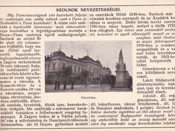 Szolnok az utolsó 30 év alatt olyan rohamosan fejlődött, hogy ma az Alföld egyik legszebb, leggazdagabb és legforgalmasabb városa a Zagyva torkolatánál 39 ezer lakossal. Szép, új indóházától paloták sorfala között a Baross-út vezet egyenesen a városba. A Kossuth-térre és a Gorove-utcába Itt van a városháza, megyeháza, törvényház, modern szállodák, állandó színház, hivatalok, élénk ipar, kereskedelem virágzik. Ide szállítják a máramarosi havasokból tutajokon a felhalmozott rengeteg faanyagot. A Zagyva hídon át a Várba jutunk, itt van a művésztelep és Damjanich tábornok lovasszobra, aki itt fényes győzelmet aratott az osztrákok fölött 1849-ben. Szolnok már a rómaiak korában szerepelt és az Árpádok korában is megvolt. Dobó István tervei szerint 1550-ben várat kapott, melyet a török 1552-ben elfoglalt. Egy város sem szenvedett pestistől, kolerától és egyéb ellenségtől annyit az országban, mint Szolnok és mégis felvirágzott! 1919-ben a románok megszállták és a vasúti hidat felrobbantották, de 1922-ben ujból felépítették a hidat.