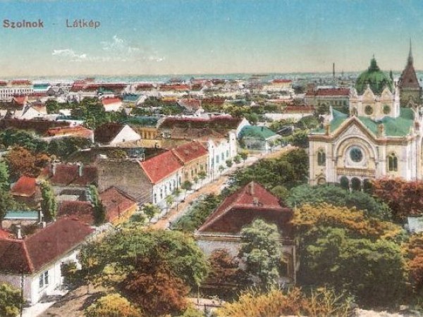 Ami miatt érdekes ez a képeslap, az a távolban álló házak. Nekem úgy tűnik, hogy a mai Sóház utca zsinagógával szembeni épületsora már látható ezen a képen. Azok a házak, amelyekről nem nagyon veszünk tudomást. Pedig, ha egyszer arra járnak, érdemes egy pillantást vetni a Szapáry és a Madách utca közötti házakra, amelyek a polgárosodó Szolnokra emlékeztetnek. Jól kivehető a képeslap bal szélén a mai múzeum, akkori szálloda épülete, a városház kupolás teteje, a zsinagóga mellett pedig a Verseghy gimnázium ma is álló épülete. A gimi mögötti kémény viszont nem a Tisza Szállóhoz tartozik, hiszen az a kép születésekor még biztosan nem állt. Inkább a helyén, illetve a Verseghy park területén egykor működő malmoknak a része lehetett.