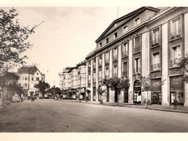 Ezt a szinte fotópapírra nyomtatott képeslapot biztos, hogy 1949 után adták ki. Abban azonban bizonytalan vagyok, hogy a fotó is ugyanakkor készült-e. A bankok feliratai miatt gyanús, hogy a kép kicsit régebbi.