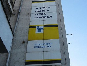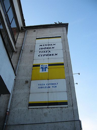 Nem tudom megmondani, hogy mikor helyezték ki a Tisza Cipő klasszikus reklámtábláját az Ady és a Ságvári kereszteződésében lévő ház falára. Mivel már az 1971-ben elfogadott márkajel látható rajta, illetve a Jubileum tér felirat, az biztos, hogy 38 évnél fiatalabbnak kell lennie. Ha meg arra gondolok, hogy a Tisza Cipő márka a rendszerváltás után nem sokkal összeomlott, lényegében megszűnt – hogy pár éve, megfizethetetlen prémiummárkaként támasszák fel – akkor azt is feltételezhetem, hogy minimum 20 éves a tábla. Amit csak a Zagyva felől a buszpályaudvar felé haladva lehet észrevenni a járda fölé benyúló ház kiugró homlokzatán.