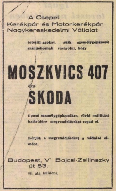 És itt volt egy olyan pillanat, amikor Moszkvicshoz és Skodához azonnal, a vételár befizetése után hozzá lehetett jutni, miként a Néplapban 1963 tavaszán megjelent hirdetés is bizonyítja. Merthogy a forgalmazó vállalat képtelen volt megbirkózni az országba először nagyobb mennyiségben érkező személyautókkal, miközben a hatvanas évek első felében azért még a fizetőképes kereslet is korlátozott volt. Hasonló esetre, azaz, amikor az állami autóforgalmazótól azonnal el lehetett hozni személygépkocsit, majd csak a nyolcvanas évek végén lesz példa, amikor 300 darab, vállalhatatlan minőségű román Oltcit érkezik az országba. Talán nem csoda, hogy volt rá vevő, hiszen Lada Samarára vagy új 1500-as Ladára hat éves szállítási határidővel vettek fel rendelést. (Fotó: Fortepan 67439 – Szolnok főutcája a hatvanas évek elején)