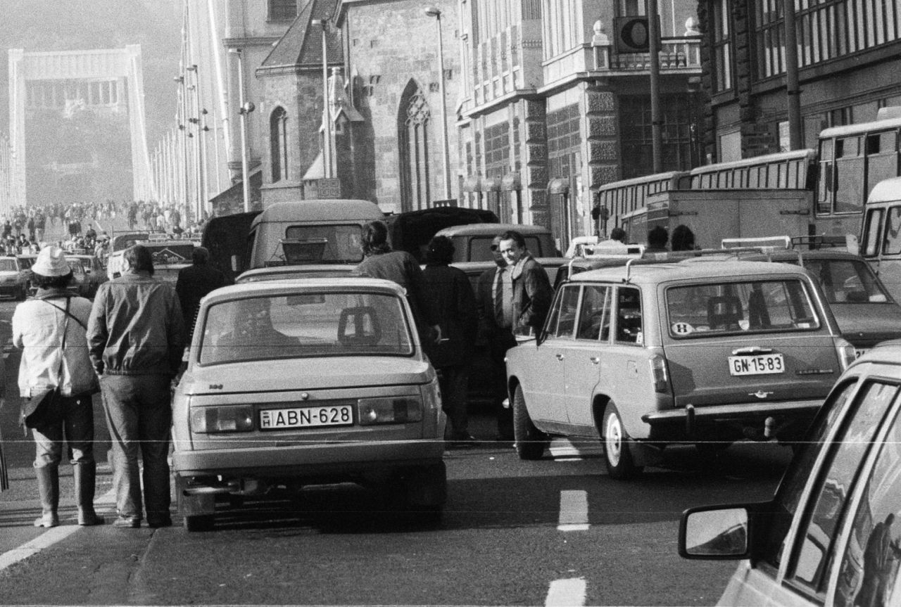 A Kádár-kor személyautó világa szerintem nem 1989-ben, Kádár-halálával és a köztársaság kikiáltásával ért véget, hanem 1988. január elseje és 1990 nyara között, fokozatosan múlt ki. Az első dátum a világútlevél bevezetése, amikor a valutakerettel és a feketén váltott schillingekkel és nyugat-német márkákkal tömegek indultak bécsi és távolabbi bevásárlásokra, köztük nem kevesen autóbeszerzésre. Mivel új autóra keveseknek futotta, ekkor jelentek meg a magyar utakon az erősen tizenéves, leharcolt nyugati járgányok, amelyek persze még így is valódi alternatívái voltak az elöregedő, többségében új korukban is már korszerűtlen hazai autóparknak. Amikre aztán 1990-től, már az Antall-kormány idején elkezdték felszerelni a nemzeti trikolórral gyártott három betű, három szám kombinációjú rendszámokat. (Fotó: Fortepan 266867 – Kétféle rendszám a taxisblokád idején)