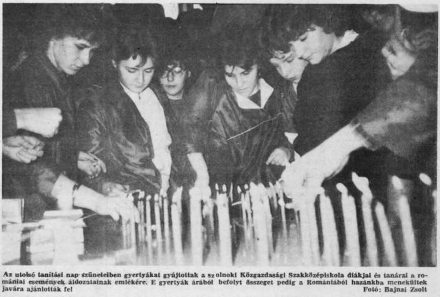 A romániai események újra összehoztak a november végi, „négy igenes” népszavazás miatt egymással szembeforduló ellenzéki pártokat, és december 18-án estére gyertyás demonstrációt hirdettek a Megyei Művelődési és Ifjúsági Központ elé. Talán nem túlzás azt mondani, hogy nem akadt intézmény, szervezet, sőt iskola, amelyik ne hallatta volna a hangját az erdélyi magyarokat is súlyosan érintő romániai események miatt. A Varga Katalin Gimnázium 2. c. osztálya például nemzetközi szervezetekhez fordult, és erre buzdította a többi diákot is. A Közgében, a téli szünet előtti utolsó tanítási napon gyertyákat gyújtottak a romániai áldozatokért, és a gyertyák árából befolyó összeget a romániai menekültek javára ajánlották fel. Karácsony után pedig sorra indultak Szolnokról is a segélyszállítmányok a lényegében kifosztott, és még mindig indulatoktól terhes erdélyi városokba.