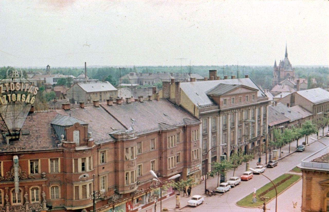 Persze az autókon kívül mást is érdemes észrevenni ezen a hatvan vagy hatvanegy éves felvételen. Például a „nagy OTP” és a Ságvári Endre Megyei Művelődési Központként funkcionáló egyemeletes épület között azt a három földszintes házat, amelyeket majd csak a nyolcvanas évek végén bontottak el, hogy a Kereskedelmi és Hitelbank épületének – ma már Szapáry irodaház – helyet csináljanak. Ezek a házak minden bizonnyal már az előző századfordulón is ott álltak a Szapáry utcában, és bár nekem nincs róla személyes emlékem, a fotóshoz legközelebb lévő, legmagasabb ház pincéjében működött a híres Sarudi féle trafik. És még egy érdekesség a képnek erről a részéről. A „nagy OTP” homlokzatán még ott virít az épületet 1937-ben megépíttető Szolnoki Hitelbank neve, ami legkésőbb 1948-ban az államosítás révén megszűnt. És bár az épület homlokzatára felrakták az Országos Takarékpénztár fényreklámját, az előző rendszerre utaló feliratot nem távolították el. Vajon miért? És mikor tűnt el?