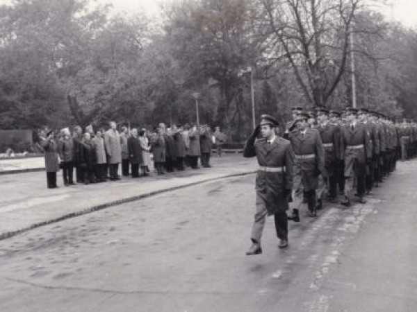 Akik előtt ezen a felvételen épp a Kilián György Repülő Műszaki Főiskola hallgatói vonulnak el díszlépésben. Ha nem tévedek, elől a végzős évfolyam, aminek tagjai majd augusztus 20-án, a Parlament előtt tettek tiszti esküt. Mögöttük az alsóbb évfolyamok, és ha jól látom, a tisztjelöltek után a sorállomány érkezett a nem létező tribün elé. Talán nem lövök nagyon mellé, ha azt mondom, hogy valahol a fotós környékén egy katonazenekarnak is lennie kellett. Hangosításnak ugyanis semmi nyoma a képen, ám nem hinném, hogy csendben vonultak volna a katonák azon a lassan negyven évvel ezelőtti, borús, áprilisi napon, amikor Nagy Zsolt a megyei napilapnak fotózott. És amikor még állt Szolnokon Lenin-szobor és működött a városban a Kilián György Repülő Műszaki Főiskola.