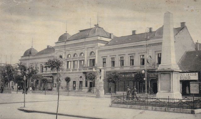 Sebők Nándor üzlete azonban az 1920-as évek végén – a képeslapok tanúsága szerint minimum három évtized után – bezárt. Helyére – az eredeti portálszekrényeket megtartva – 1930-ban a Szécsi és Sohr nevű cég költözött, akik díszműáruk kereskedésével foglalkoztak. Hogy korábban hol volt üzletük, nem tudom. Az azonban biztos, hogy maga a cég 1920-ban kezdte meg működését, mindkét tulajdonosa vitézül harcolt az első világháborúban az orosz fronton, és a második világháború éveiben már sem az üzletük, sem az eredeti kirakatok nem lehettek ott a Kossuth téren. Ez az 1930 után készült, nem túl jó minőségű képeslap egy másik, Kossuth téri változásra is felhívja a figyelmünket. Az első világháború előtt a tér keleti oldalán – ennek a fotónak az előterében -, a Szentháromság-szobrunk előtt és mögött viszonylag idősebb fákból álló két sor húzódott. A két háború után készült lapokról azonban ezek az „öreg” fák már hiányoznak.