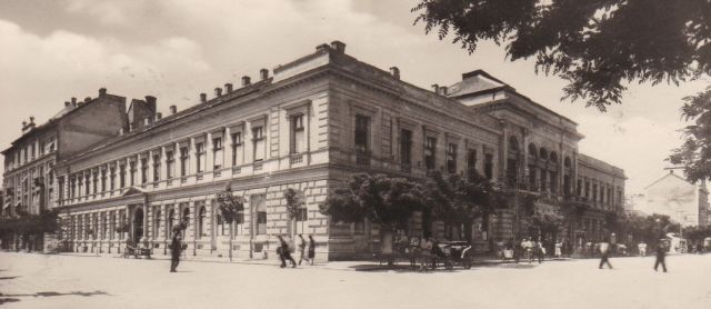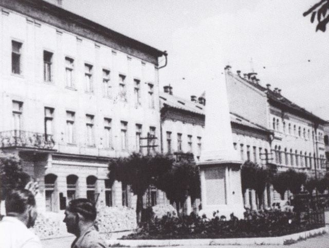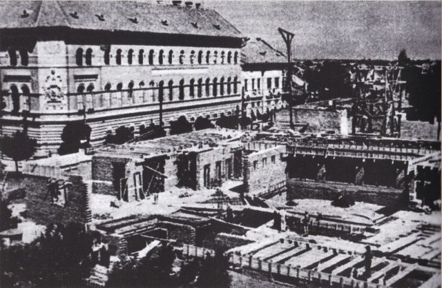 A köztéri alkotások eltűnése mellett a legjelentősebb változás a téren az ötvenes években az úgynevezett 1. számú irodaház, Szolnok első „Sztálin barokk” épületének a felhúzása volt. Ezt az ötvenes évek elején kezdték építeni – a mellékelt fotó Kardos Tamás Múltlapozgató könyvéből való -, és 1952-ben már állt. Ez volt a város első modern irodaháza, ami erősítette a tér igazgatási központ funkcióját a háború előtti kereskedelmi jelleggel szemben. Hogy kik voltak az első használói, sajnos nem tudom, mindenesetre érdekes, hogy a legvadabb Rákosi-években nem pártházat építettek először ilyen stílusban Szolnokon. Az pedig kifejezetten fontos, hogy az irodaház építése tette lehetővé, hogy Kaposvári Gyula legalább a tér egy részét feltárja régészetileg.