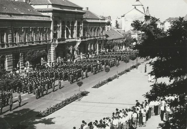 Nyilvánvaló, hogy a Kossuth tér 1945-től kezdődően, majd 1950-től egészen egyértelműen a helyi politikai rendezvények – április 4-ei, május 1-jei felvonulások, március 21-ei és november 7-ei megemlékezések és egyéb politikai gyűlések – helyszíne lett. Éppen ezért rendkívül érdekes számomra, hogy az ennek megfelelő „berendezésre”, és mondjuk, ezt a szellemiséget hordozó szobor felállítására csak a hatvanas évek elején került sor. Ezt részben Czinege Lajos működésével tudnám magyarázni, aki megyei első titkárként azon ügyködött, hogy a térből a Tisza irányába egy monumentális placcot nyissanak, a végén Sztálin szobrával, ami feleslegessé tehette a Kossuth tér átrendezését. Aztán pedig a Nagy Imre nevéhez köthető enyhülés, majd az 1956-os események odázták el az átalakítást. Ami előtt aztán a Kádár-rendszer megszilárdulásával – ennek egyik momentuma a fenti fotón látható, 1957-es szolnoki Munkásőr ünnepség (a Manda tulajdona) – megnyílt a lehetőség, de az már a Kossuth terünk történetének egy következő fejezete.