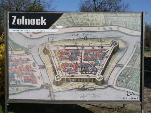 A hídon átérve érdemes először az ártérre lemenni, és az ott lévő, a stilizált várfalra, valójában a gátra helyezett emléktáblákat megnézni. Ezek között van, amelyik már a 2000-es nagy árvíz előtt is itt volt, például amelyiken Vitkovics Mihály (1778-1829) Külső-Szolnok vára című epigrammája olvasható. Mellette a szolnoki palánkvár 1617-es ábrázolását láthatjuk, illetve Tinódi Lantos Sebestyén 1552 körül keletkezett versét olvashatjuk, amely nagyjából leírja a torkolatban akkor fekvő erősséget. Innen feltekinthetünk a készülő műbástyára, majdani látogató központra, amit ki-ki a maga ízlése szerint minősíthet, nem megfeledkezve arról, hogy a következő évtizedekben ez a modern építmény lesz a „szolnoki vár”.