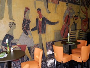 Kezdjük azzal, hogy Szolnok legnagyobb sgrafitto képe mellett kávézhatunk. Ludmány Ottó Kompozíció című vakolatképe valamikor 1962-ben készült, abban az évben, amikor a Kossuth tér új lakóházát, földszintjén a Múzeum étteremmel átadták. A képet a rendszerváltás után elfalazták, majd az előző bérlő 2007 körül kibontatta, a mostani pedig egy kicsit még fel is újíttatta. Ezzel pedig a város egyik legérdekesebb belső terű kávézóját hozta létre. Amihez persze az igényes bútorzat is sokat hozzátesz.