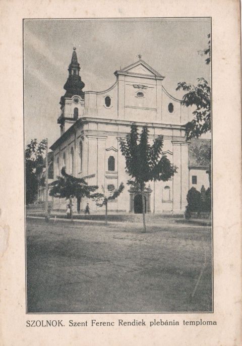 És, hogy teljesen körbejárjuk a Belvárosi Nagytemplomot, azaz a Szent Ferenc rendiek plébánia templomát, következzen egy újság képes mellékletében megjelent fotó, ami nagyjából a Mária utcai torkolattól örökítette meg az épületet. Az 1919 és 1944 között létezett Nemzeti Újság Képes Műmellékletében megjelent képeslap a templom főbejárata felőli oldalát mutatja, és hogy csak az első világháború utáni felvételről lehet szó, azt leginkább a belvárosi általános iskola távolban már feltűnő épülete mutatja. Ugyanakkor érdemes azt is észrevenni, hogy a fotó jobb szélébe belelóg az a kálvária, amit majd csak 2004-ben, a Szentháromság tér felújításakor helyeztek át a rendház kerítéséhez. A felvétel készítésekor már nemcsak szekerek döcöghettek a templom melletti macskaköves úton, de minden bizonnyal autón is érkeztek hívek a több évtizeddel ezelőtti húsvéti szertartásokra, Szolnok legnagyobb és legrégebbi templomába.
