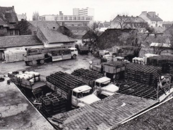 Mert, aki emlékszik a fotón látható szovjet ZIL-ek hangjára, vagy a fa platókra feltornyozott rekeszek csörömpölésére, az el tudja képzelni, micsoda zajjal járhatott, amikor egy-egy ilyen szerelvény a képen látható apró udvaron forgolódni kezdett, majd a Magyar utcára egyesbe kihajtott, aztán komótosan gyorsítani kezdett. A fogyasztást és az autó nyomában maradó bűzt most nem is említsük. Nem sokkal volt csendesebb a dupla fülkés Skoda/LIAZ sem, amit nagyjából a fotó közepén látunk lenyitott platóval és felkapcsolt pótkocsival. El nem tudom képzelni, milyen forgalom lehetett ezen a telepen – és emiatt a környező utcákban -, ha ezen az őszi felvételen is hét teherautó van éppen az udvaron.